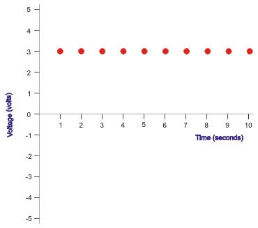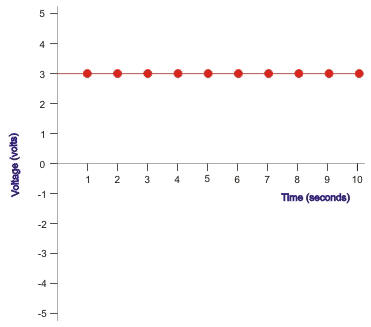 Although we haven't measured between 1 and 2 seconds or for any other of the time intervals, it might be a safe bet to say that the voltage is probably the same so we might complete the graph by connecting the points with a line as shown below: