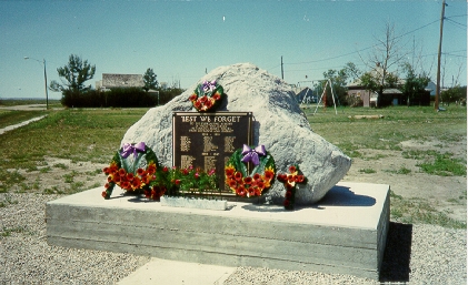 In July 1988, the Village of Meyronne held a homecoming and the 75th Anniversary of the Village. At this time the "Royal Canadian Legion Branch #204" Lafleche Sask. performed the dedication ceremony of the new Cenotaph in a very impressive manner.