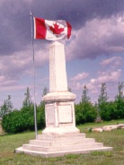 The Woodrow Cenotaph was constructed in the memory of all the veterans who lost their lives in World War I and World War II. The Legwin Branch and Ladies Auxiliary, then the BESL (British Empire Services League) in 1927 contracted with the Regina Monumental Company to erect this monument, supplying materials and labour to the sum of $800.00. It was built on CPR property adjoining the station. The monument was made from Tyndal stone, the same stone used in the Saskatchewan Legislative Building. Due to the lack of care at this site the monument was moved to the Woodrow cemetary, about one mile south of Woodrow. The moving process started in 1997, and finished in 1998. In October 1998 the monument plaques were replaced. These plaques bear the following names:
